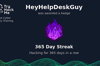 Finally hit the rare, 365 Day Streak on TryHackMe and now I’m in the top 3% in the site.